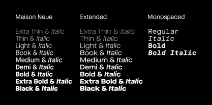 Maison Neue is the completely reworked version of our original Maison typeface family. While the earlier version was constructed using rigid elements, Maison Neue has been meticulously redrawn to be less formulaic and have a stronger focus on optical criteria to create a distinct grotesque paying greater attention to harmony, rhythm and flow. In 2017, Maison Neue was further developed and expanded into a super family of 40 styles. This includes the subtly condensed original version, an extended counterpart, a mono-spaced alignment—all featuring additional weights within each family.